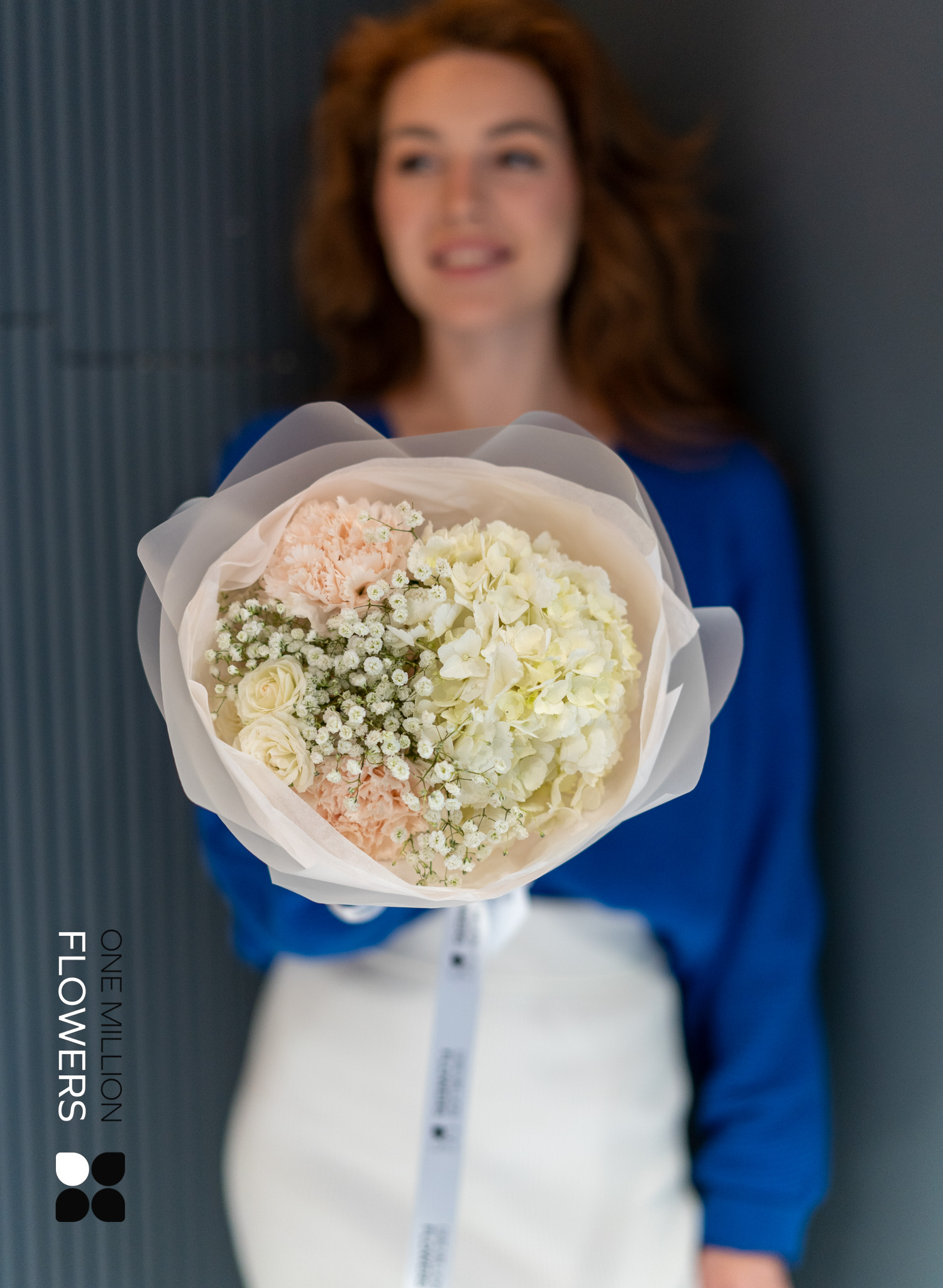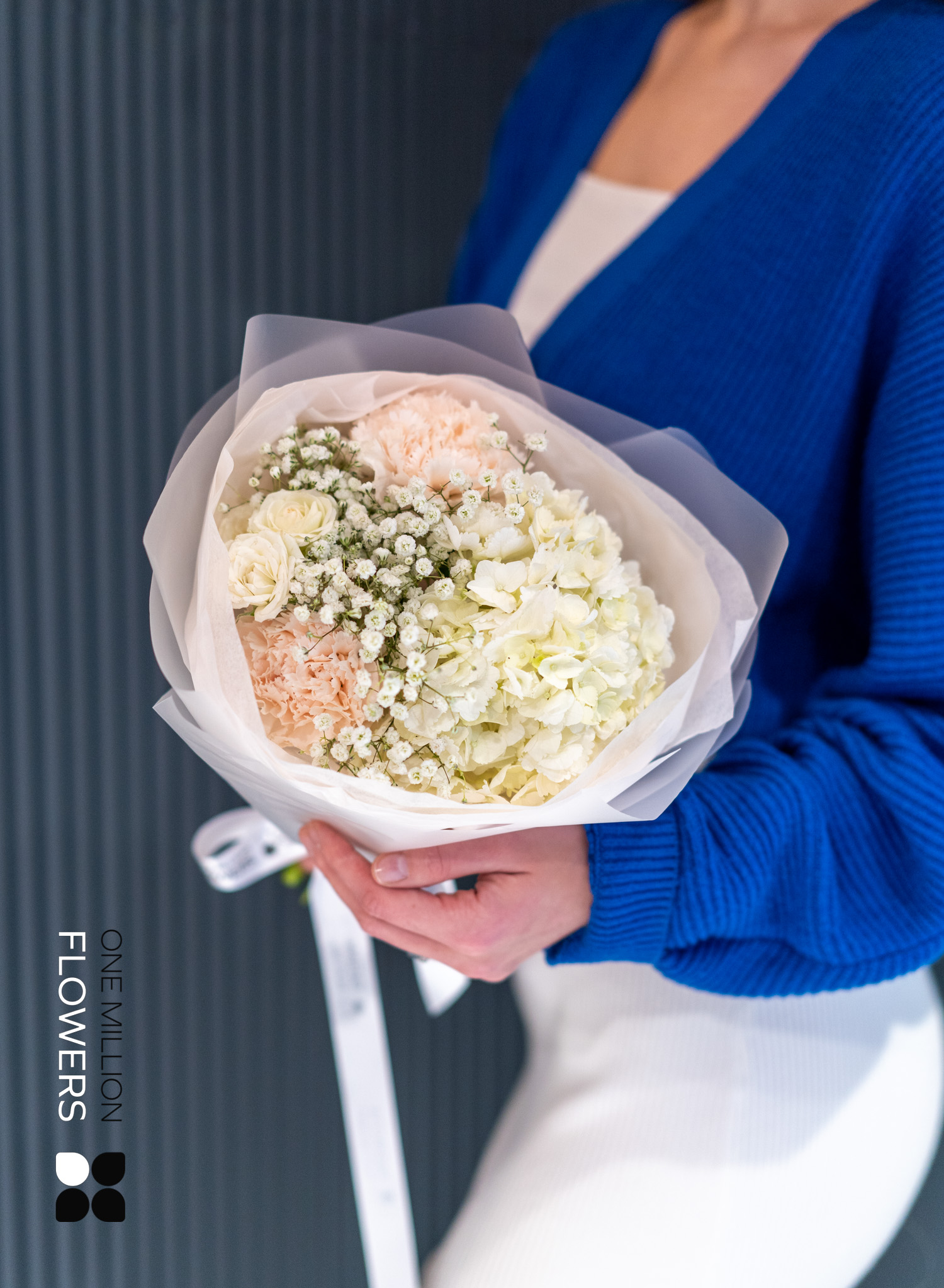 Букет "Диa Брют" Mate пленит своей свежестью. Кремовые диантусы добавляют мягкости, а белая роза Сноуфлейк символизирует чистоту и искренность чувств. Гортензия, с её роскошными соцветиями, подчеркнёт индивидуальность и стиль, привнося в атмосферу нотки романтики и элегантности. Гипсофила, известная своей воздушностью, добавляет легкость и очарование, становясь идеальным акцентом в композиции.