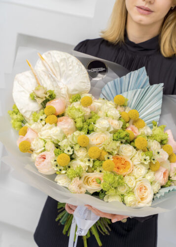 В состав букета "Еллоу Концепт" White вошли: - Орнитогалум — 7 шт. - Пионовидная роза Вайт Охара — 10 шт. - Пионовидная роза Девид Остин Джульетта — 11 шт. - Эустома Белая — 8 шт. - Роза кустовая Сноуфлейк (белая) — 10 шт. - Антуриум — 3 шт. - Краспедия — 21 шт. - Сухоцветы Пальма копье — 2 шт. Каждый компонент создает уникальную текстуру и общее настроение букета, а разнообразие форм и оттенков белого делает его универсальным вариантом для любого повода.