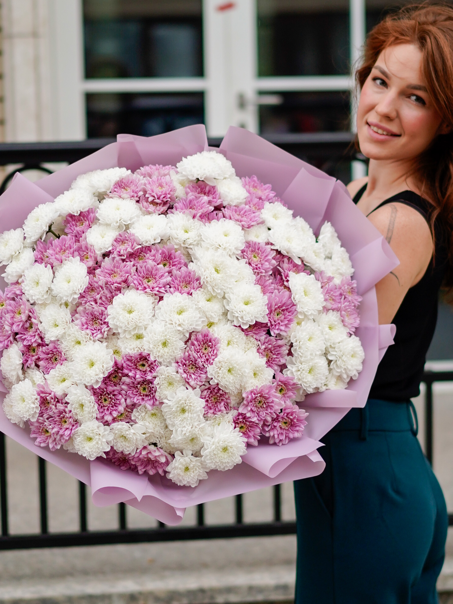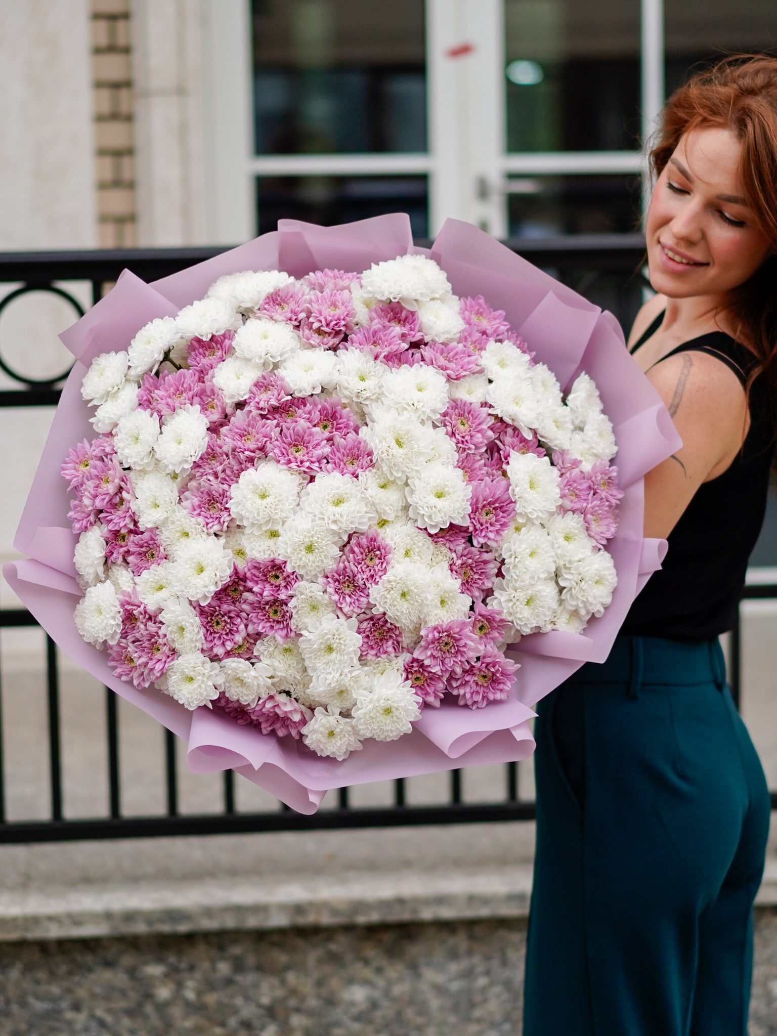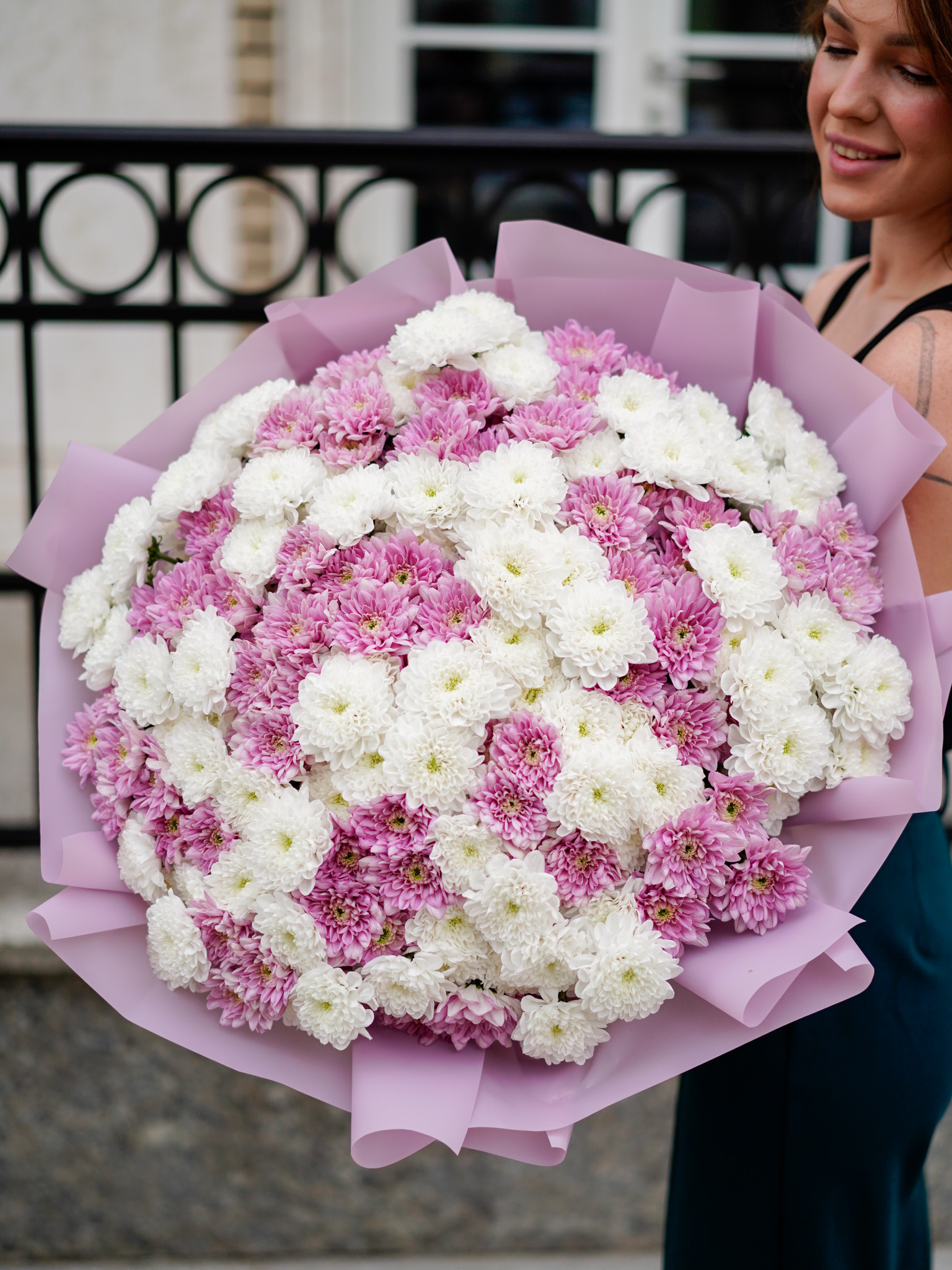 Безупречное сочетание цветов: белая хризантема символизирует искренность, а розовая — нежные эмоции и заботу.