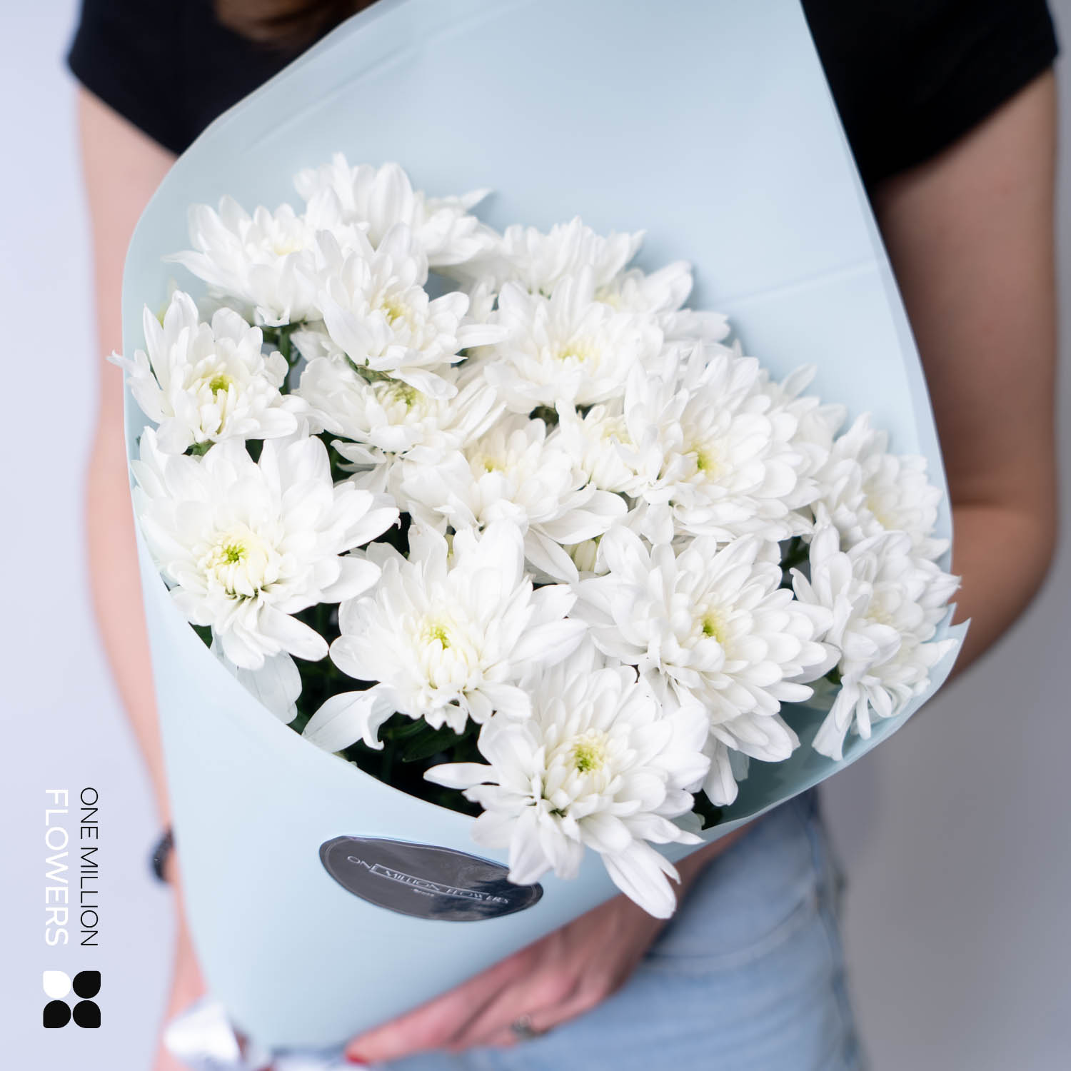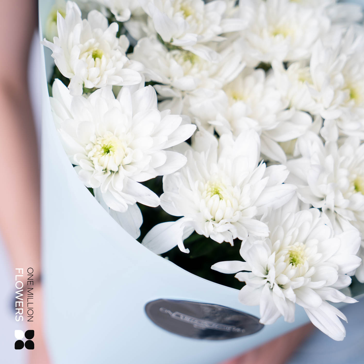Хризантемы сорта "Балтик" — это крупные, пушистые цветы с насыщенным белоснежным оттенком лепестков и густой формой. В этом букете они собраны в плотную, объемную композицию, которая выглядит стильно, лаконично и торжественно. Контраст свежей зелени подчёркивает холодную белизну цветков, создавая чистый, благородный образ. Такой букет особенно хорош для интерьера в скандинавском стиле или в качестве утончённого делового подарка.