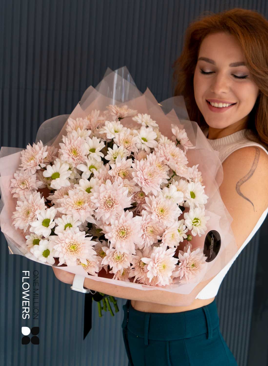 Букет "Сантини Палермо" Grand — это сочетание невероятной красоты и изысканности. В его составе вы найдёте 5 кустовых хризантем белого цвета и 10 кустовых хризантем розового. Эти цветы создают гармонию и наполняют букет свежестью, что делает его идеальным подарком для любого события.