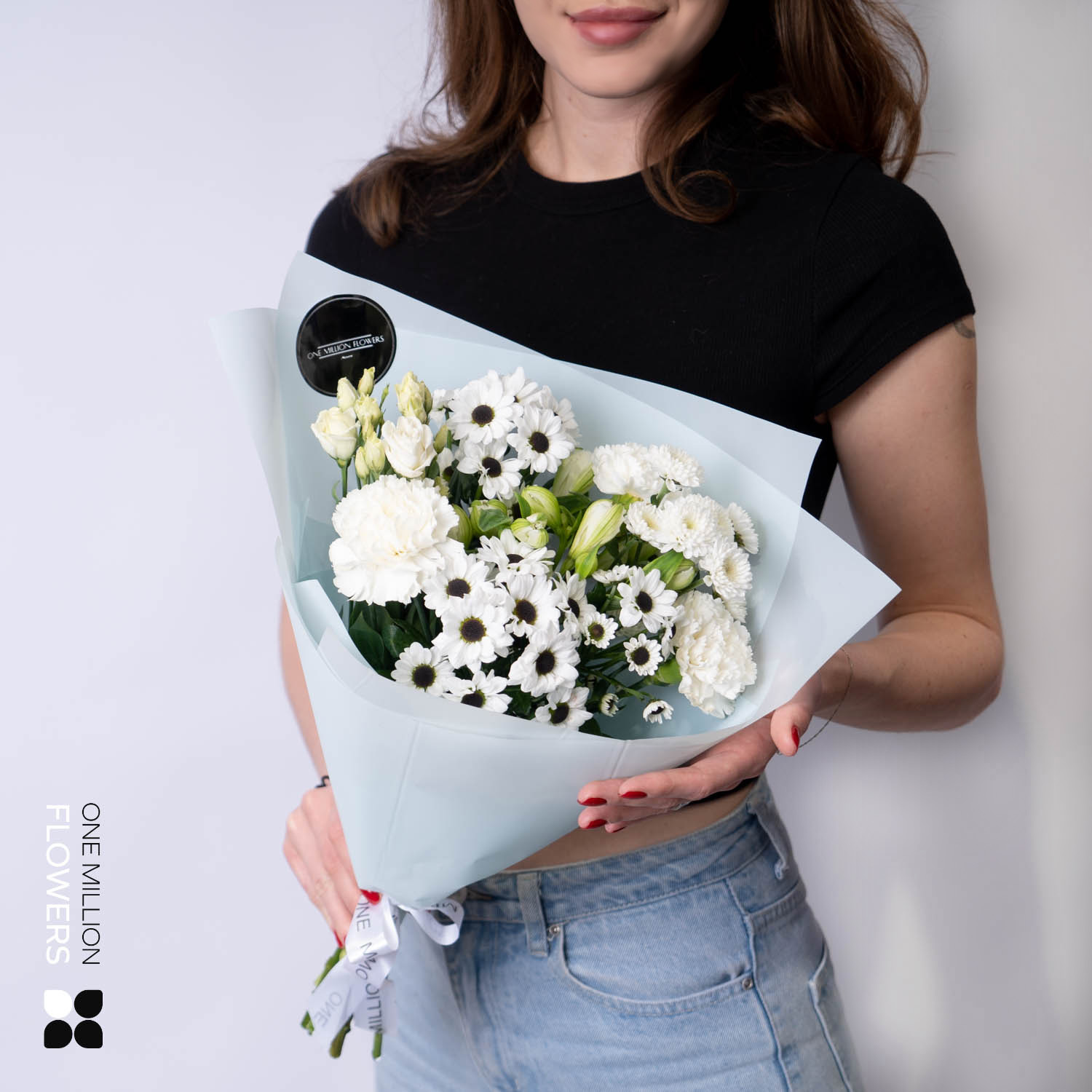 Букет "Шимона Вайт" — это изысканная композиция, в которой сочетаются красота и свежесть лучших цветов. В его составе: хризантема Сантини белая (3 шт.), диантус белый (2 шт.), эустома белая (1 шт.), альстромерия (2 шт.). Каждый цветок в этом букете несет в себе часть тепла и заботы, создавая неповторимое настроение.