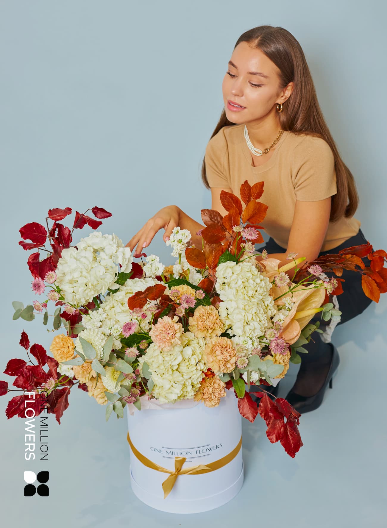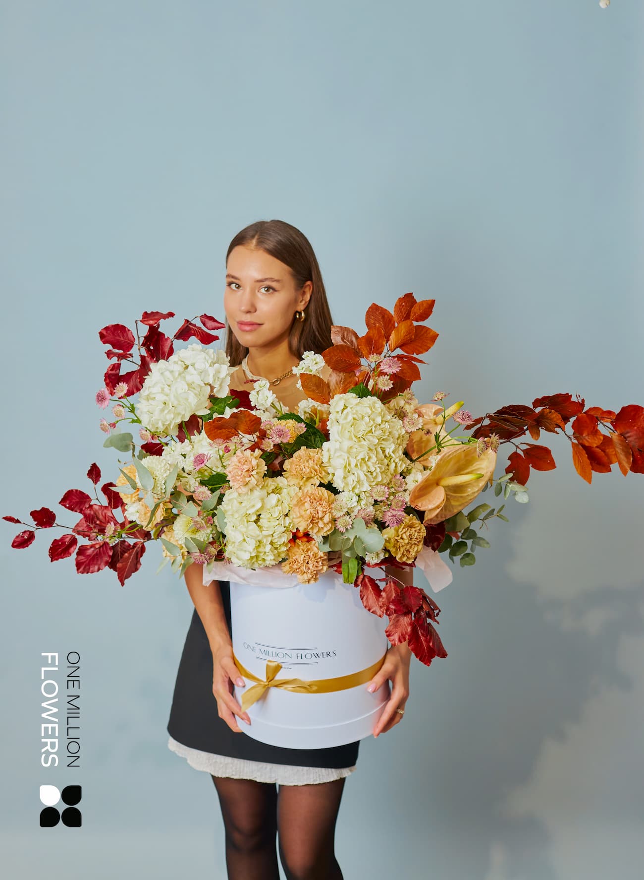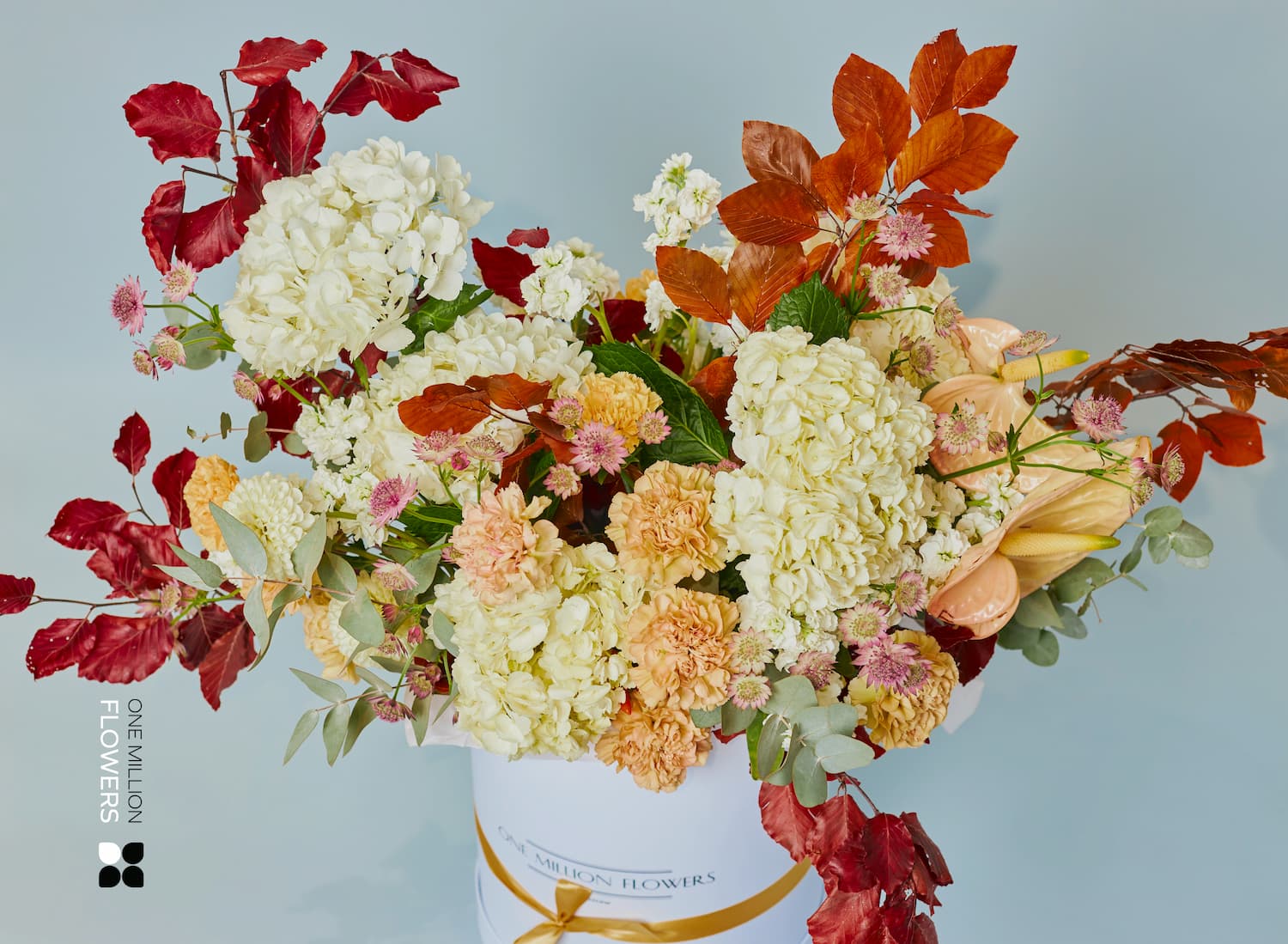 Коробка «Аутум Дрим» наполнена натуральными элементами, вызывающими атмосферу осени. В её составе вы найдёте 2 стабилизированные листья бука, которые добавляют уникальности и естественности. 15 кремовых гвоздик диантус, с их нежными лепестками и неповторимым ароматом, сделали эту композицию по-настоящему очаровательной. Также здесь присутствуют 2 антуриума, 2 веточки эвкалипта и многолетние астрации, которые добавляют композиции структуру и выразительность. Пять белых гортензий и маттиолы обеспечивают объем и пышность, а два белых георгины завершают облик, придавая букету завершенность и гармонию.