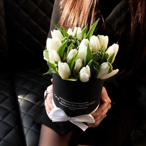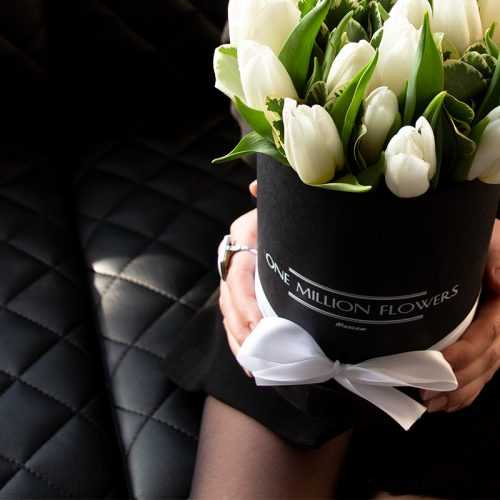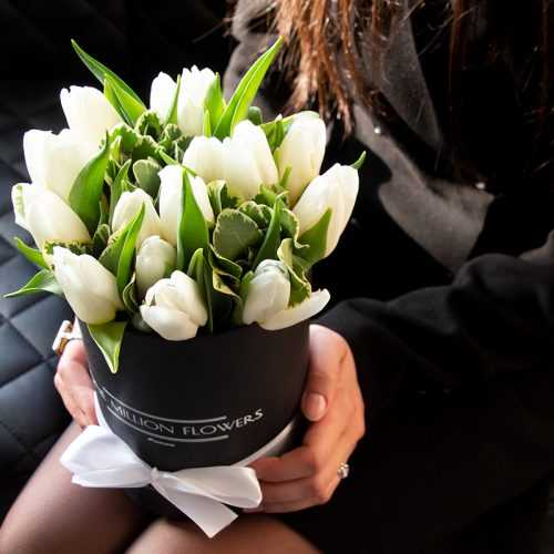 Уникальный букет тюльпанов с особенной ноткой стиля представляет коробка тюльпанов "Антарктика Лайт". Элегантная композиция, состоящая из 15 белоснежных тюльпанов, 5 веточек питоспорума и коробки Midi Black, заметно выделяется на фоне других цветочных аранжировок.